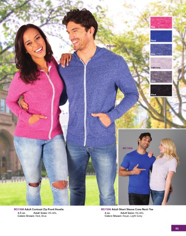 Red Royal BG7308 Blue Light Grey Grey Black BG7306 BG7308 Adult Contrast Zip Front Hoodie BG7306 Adult Short Sleeve Crew Neck Tee 4.5 oz. Adult Sizes: XS-4XL 4 oz. Adult Sizes: XS-4XL Colors Shown: Red, Blue Colors Shown: Royal, Light Grey 61