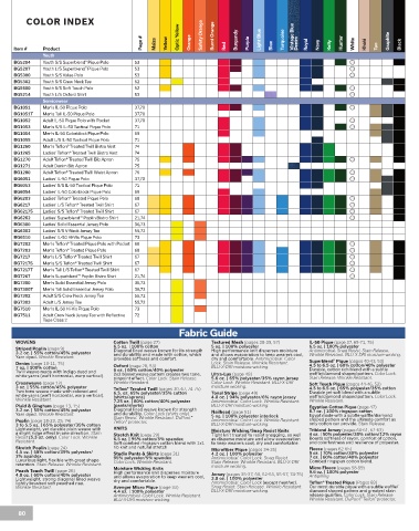 3 oz. | 55% cotton/45% polyester Teflon® Treated Twill (pages 30, 67, 74-75) moisture wicking. 4.5 to 6.5 oz. | 65% polyester/35% cotton